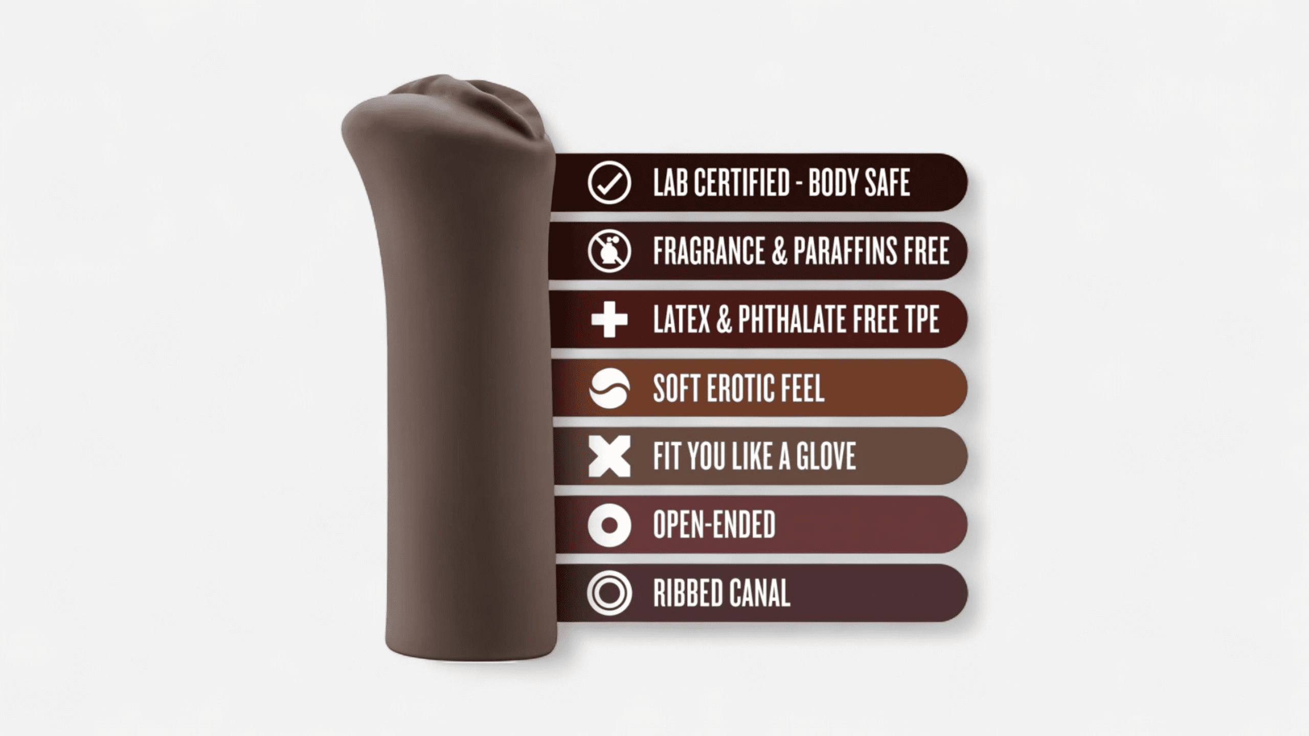 HU: Barna színű férfi maszturbátor hátulról, nyitott végű kialakítással a könnyű tisztítás érdekében EN: Brown male masturbator back view with open-ended design for easy cleaning